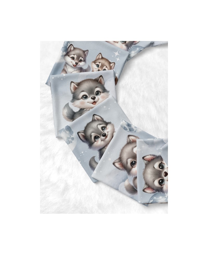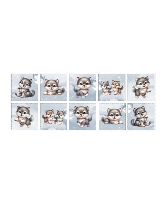 Panneau de tissu en coton prémium Oeko-tex standard 100 représentant des bébés louveteaux pour la réalisation de lingettes composé de 10 carrés de 12x12 cm.