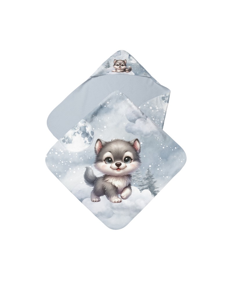 Le design met en scène un adorable louveteau, aux grands yeux expressifs, évoluant dans un univers hivernal doux et onirique. Posé sur des nuages cotonneux, sous une lune pâle et une fine pluie de flocons, il évoque la tendresse, la protection et l’émerveillement. Illustré dans un style aquarelle délicat, ce motif invite à la douceur et au calme, idéal pour accompagner les rituels du bain dans une atmosphère rassurante et apaisante.