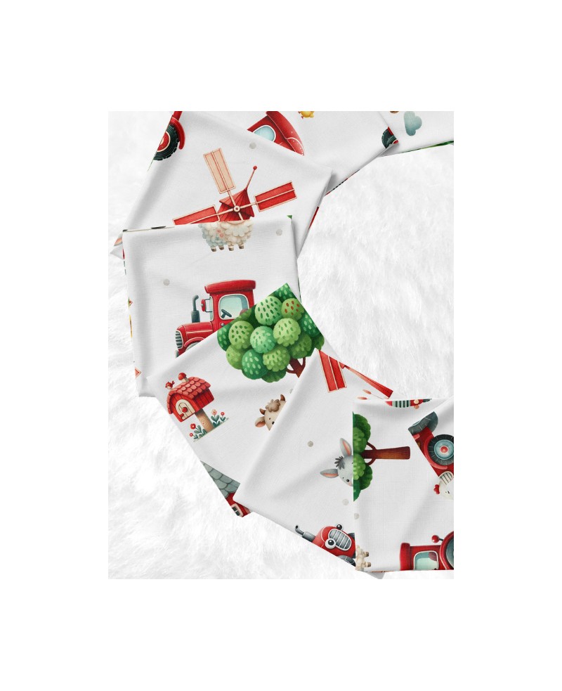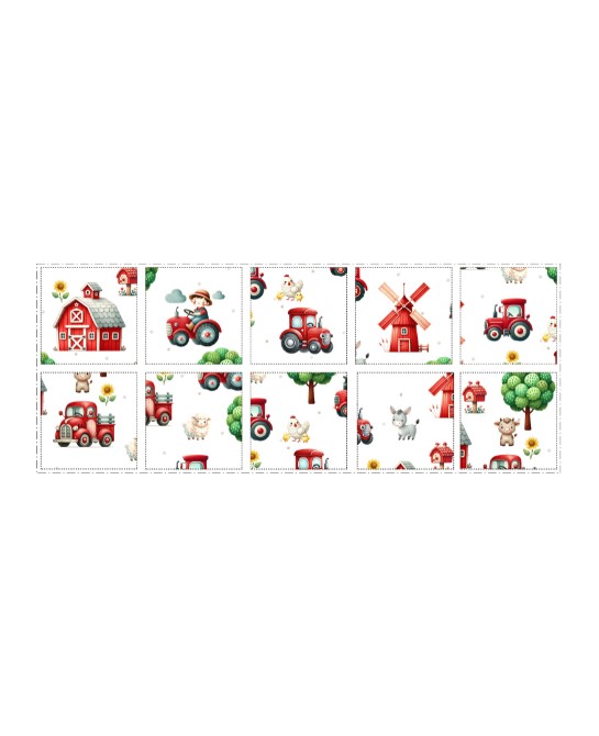 Composé de 10 carrés de 12 × 12 cm, il met en scène un univers joyeux autour de la ferme : tracteurs rouges, animaux adorables, moulins, granges et petits paysages champêtres aux couleurs douces.