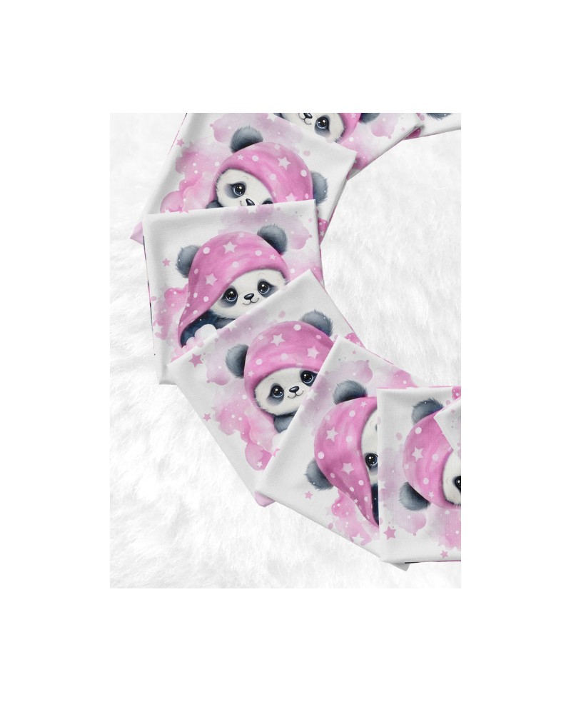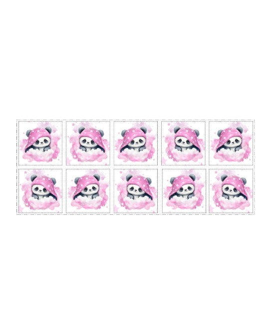 Panneau de tissu en coton prémium Oeko-tex standard 100 représentant des bébés pandas pour la réalisation de lingettes composé de 10 carrés de 12x12 cm.