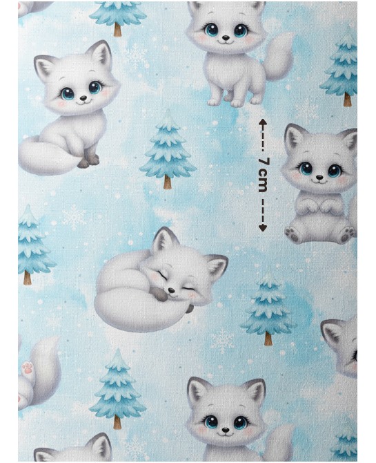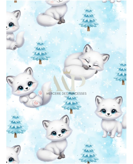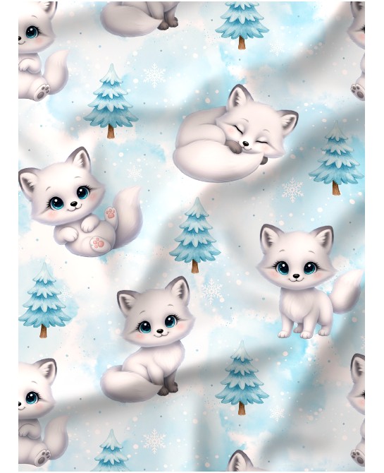 Ce motif nous plonge dans un univers hivernal doux et apaisant. Sur un fond bleu givré parsemé de petits sapins enneigés, de charmants bébés renards blancs s’amusent, se blottissent ou observent avec leurs grands yeux pétillants. Chaque illustration, délicatement aquarellée, mêle tendresse et fraîcheur, créant une ambiance polaire poétique et lumineuse.