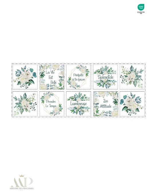 Panneau de tissu en coton premium certifié Oeko-Tex Standard 100, illustré de motifs eucalyptus, idéal pour la réalisation de lingettes démaquillantes. Le panneau est composé de 10 carrés de 12 × 12 cm.