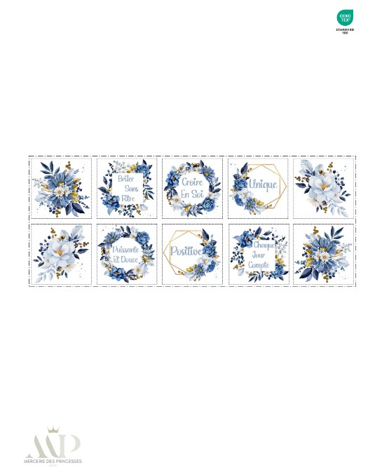 Panneau de tissu en coton premium certifié Oeko-Tex Standard 100, illustré de motifs fleurs fleus, idéal pour la réalisation de lingettes démaquillantes. Le panneau est composé de 10 carrés de 12 × 12 cm.