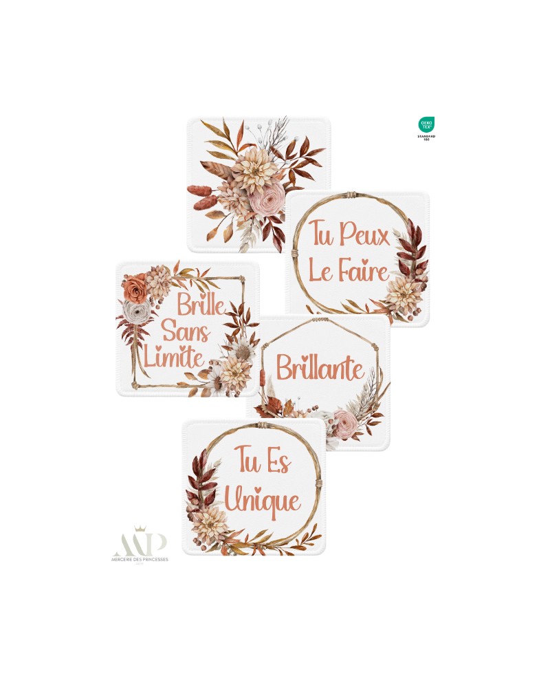 Panneau de tissu en coton premium certifié Oeko-Tex Standard 100, illustré de motifs fleurs terracotta, idéal pour la réalisation de lingettes démaquillantes. Le panneau est composé de 10 carrés de 12 × 12 cm.