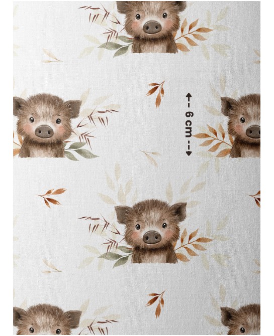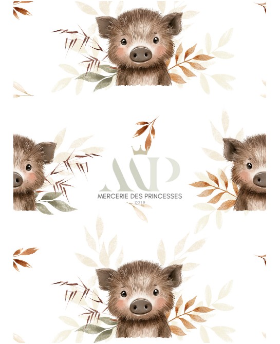 Ce motif nous emmène au cœur d’une forêt douce et poétique, où un adorable petit marcassin pointe le bout de son museau parmi les feuillages légers. Entouré de feuilles délicates aux tons beiges, bruns et verts doux, il incarne la tendresse et la tranquillité des sous-bois.