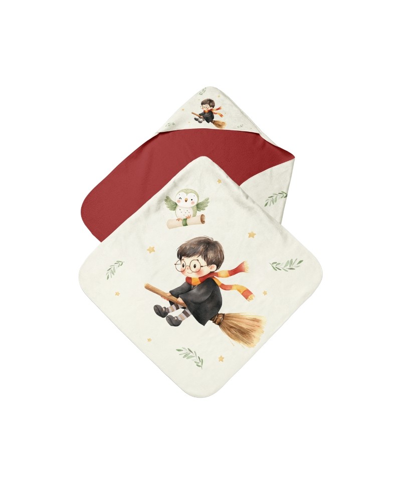 Le design met en scène un adorable petit sorcier aux lunettes rondes, s’envolant joyeusement sur son balai, accompagné d’un tendre oisillon. Illustré dans un style aquarelle délicat, ce motif évoque l’imaginaire enfantin, la bienveillance et la douceur, parfait pour accompagner les rituels du bain dans une atmosphère chaleureuse et apaisante.