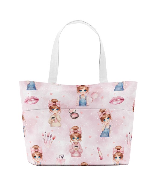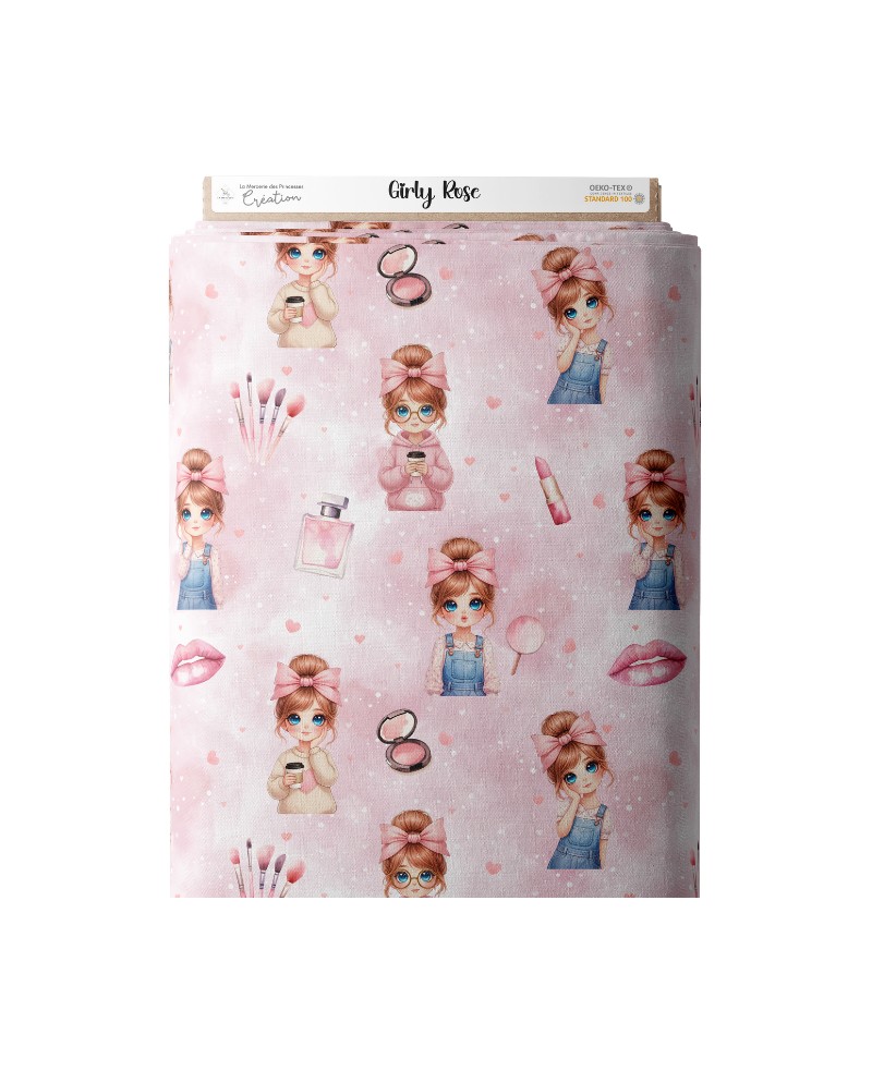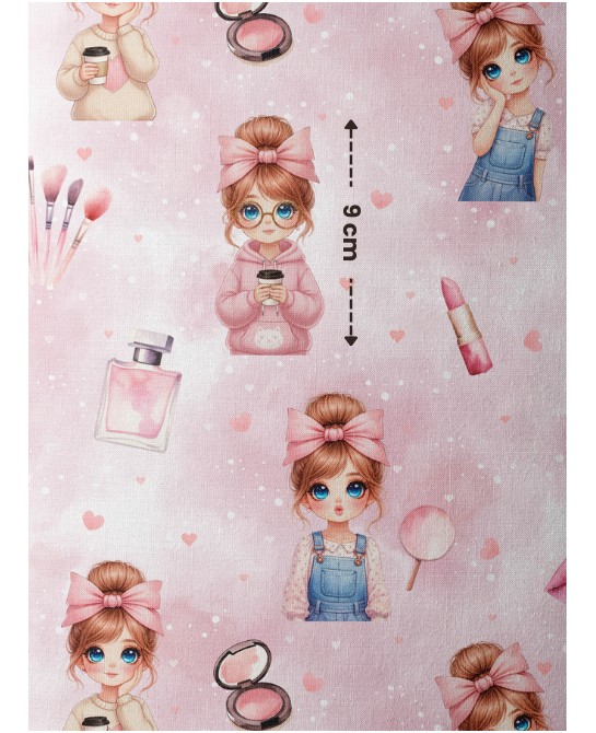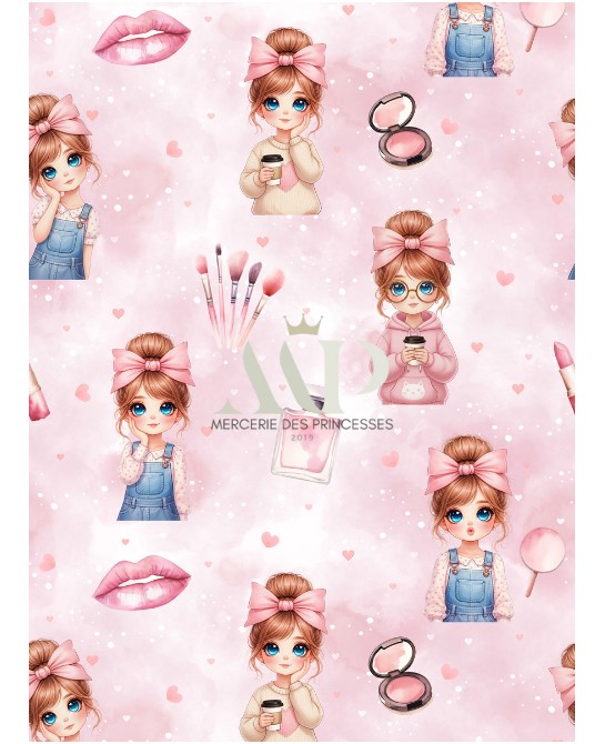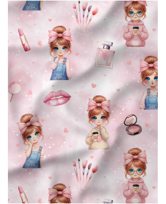 Ce motif nous plonge dans un univers délicat et résolument girly, empreint de douceur, de fantaisie et de poésie. Sur un fond rose poudré vaporeux, de charmantes petites filles aux grands yeux lumineux évoluent parmi des éléments de maquillage raffinés — pinceaux, poudriers, flacons et jolis rubans — ponctués de petits cœurs discrets qui renforcent l’atmosphère tendre et rêveuse.