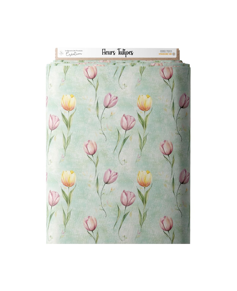 Créez des projets de couture élégants et intemporels avec ce tissu “Fleurs Tulipes” en coton certifié Oeko-Tex.