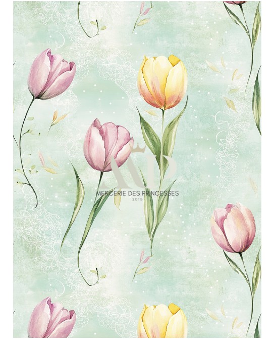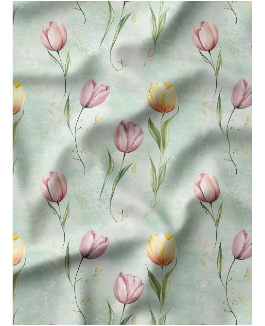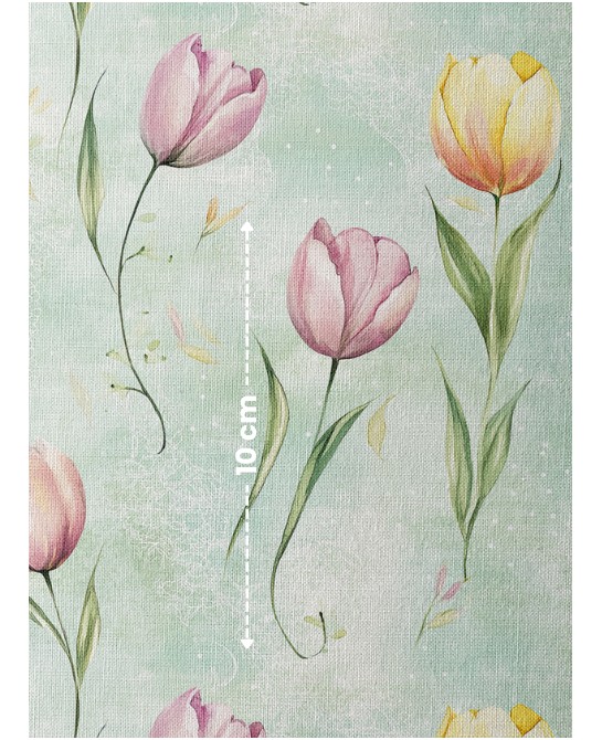 Ce motif floral évoque la fraîcheur du printemps et la simplicité élégante des jardins en fleurs. Sur un fond vert d’eau doux et lumineux, de fines tulipes aux teintes pastel — rose poudré et jaune délicat — se déploient avec légèreté, accompagnées de tiges élancées et de feuillages discrets peints à l’aquarelle.