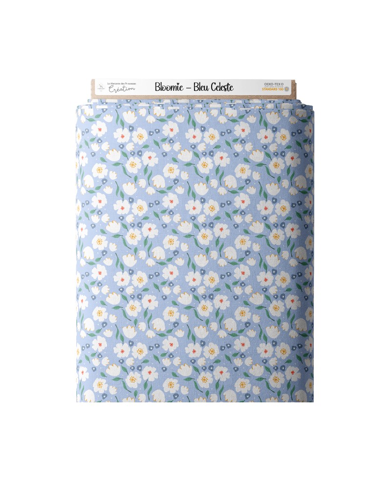 Créez des projets de couture élégants et intemporels avec ce tissu “Fleurs Bloomie – Bleu Céleste” en coton certifié Oeko-Tex.