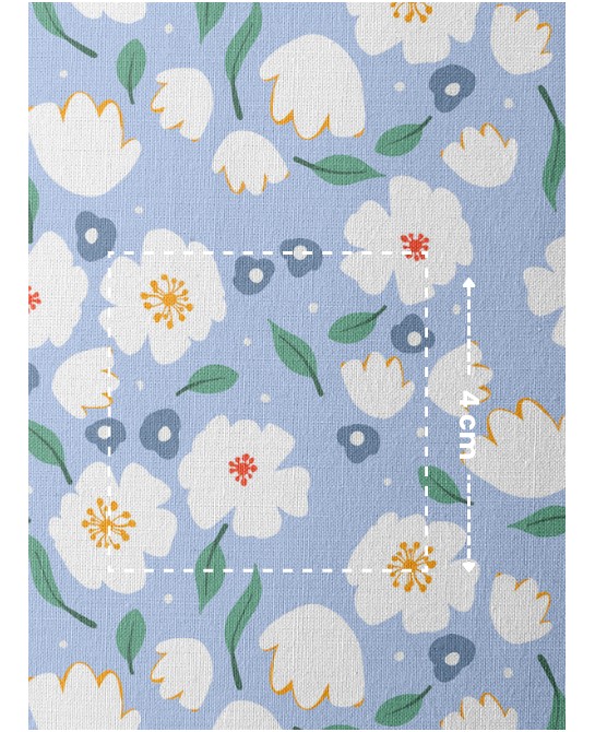 La palette apaisante évoque la fraîcheur du printemps et la douceur des ciels d’été. Le dessin, volontairement simple et régulier, rappelle les imprimés floraux classiques tout en conservant une allure moderne et facile à associer.