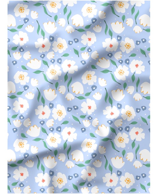 Le motif Bloomie – Bleu Céleste décline l’esprit floral iconique dans une version fraîche, douce et intemporelle. Sur un fond bleu clair lumineux, de petites fleurs stylisées aux teintes blanc éclatant, jaune doux, bleu grisé et vert tendre se répartissent harmonieusement, accompagnées de feuillages fins pour un rendu léger et équilibré.