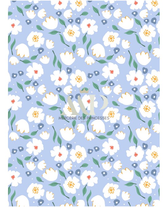 Tissu coton imprimé Fleurs Bloomie – Bleu Céleste - Certifié Oeko-Tex®