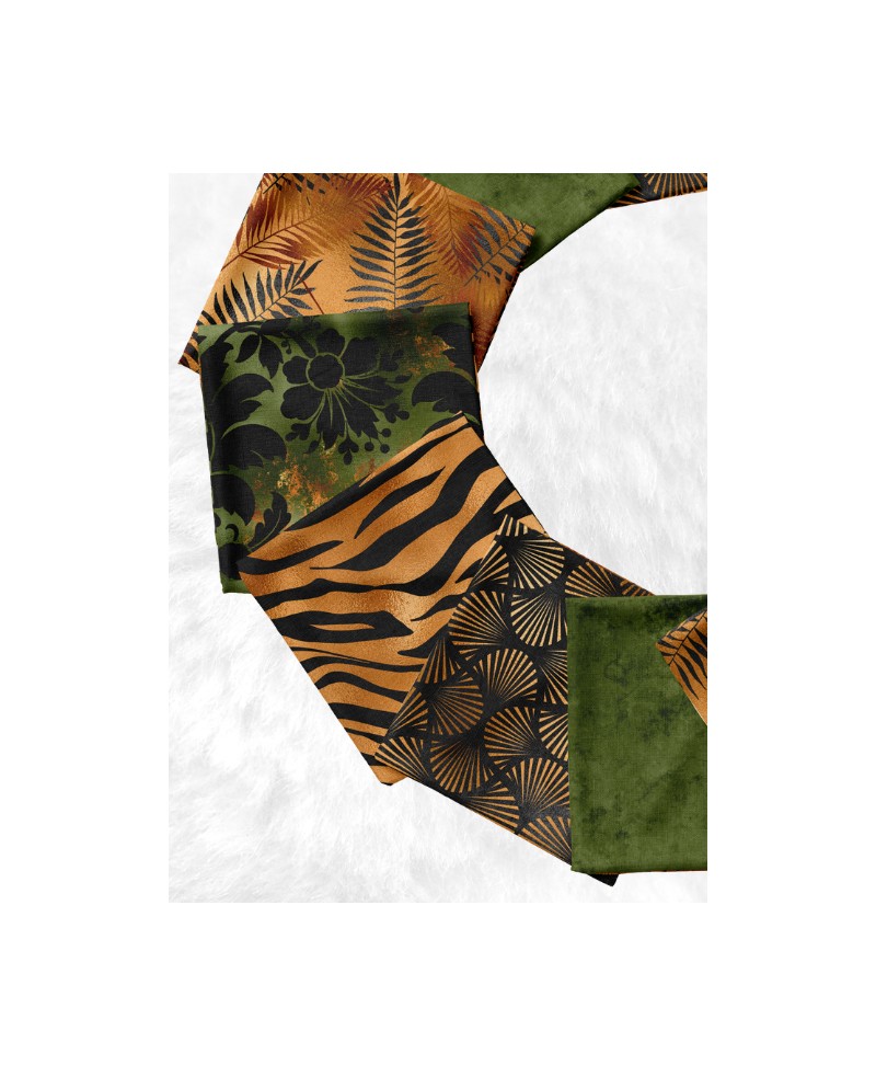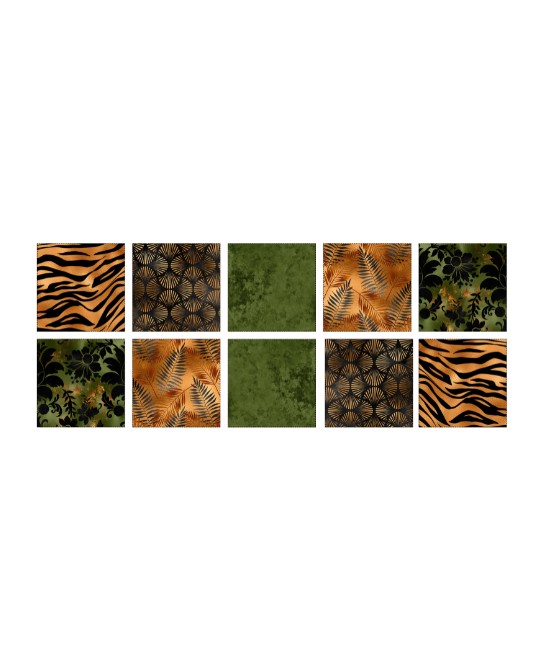 Panneau de tissu en coton premium certifié Oeko-Tex® Standard 100 pour la confection de lingettes lavables, composé de 10 carrés de 12 × 12 cm aux motifs jungle chic noir, vert et doré.