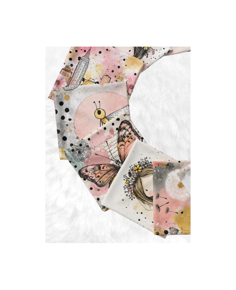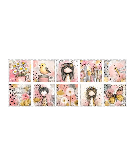 Panneau de tissu en coton premium certifié Oeko-Tex® Standard 100 pour la confection de lingettes lavables, composé de 10 carrés de 12 × 12 cm aux motifs poétiques et floraux, dans un univers doux et harmonieux.