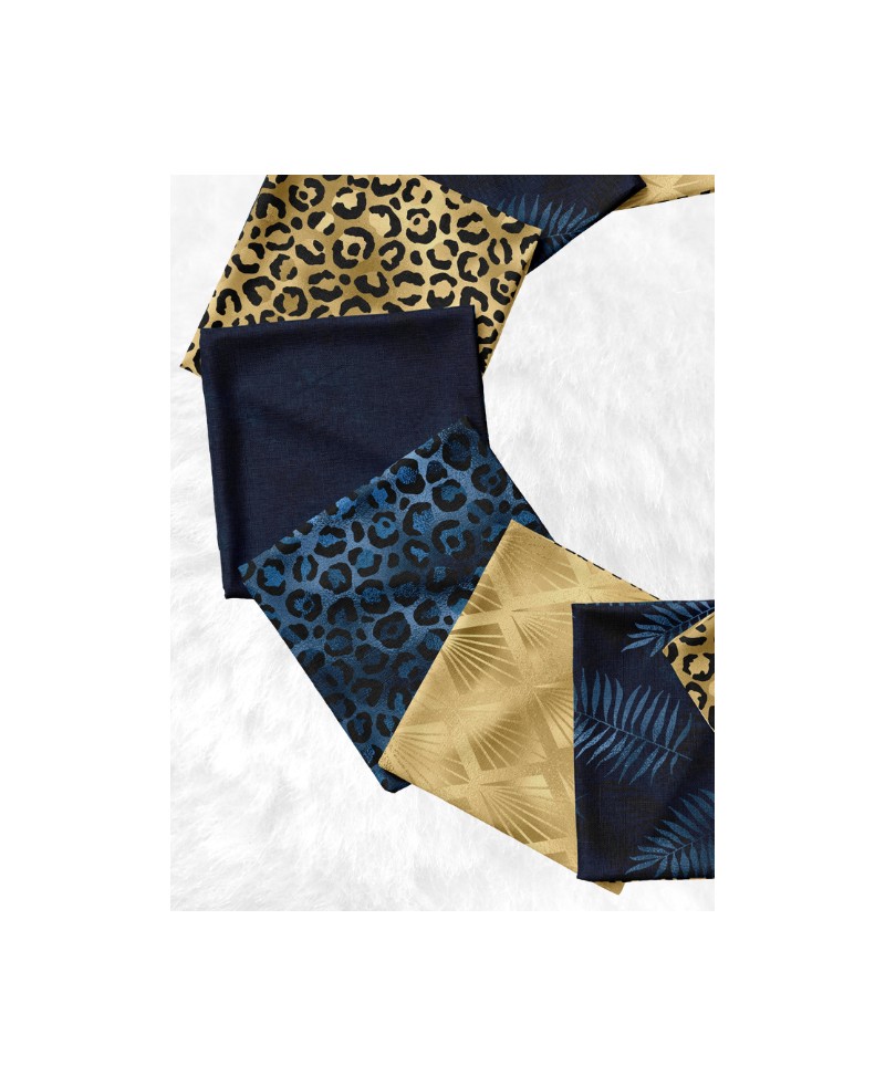 Panneau de tissu en coton premium certifié Oeko-Tex® Standard 100, spécialement conçu pour la couture de lingettes lavables. Il comprend 10 carrés de 12 × 12 cm aux motifs léopard chic bleu et or, élégants et intemporels.