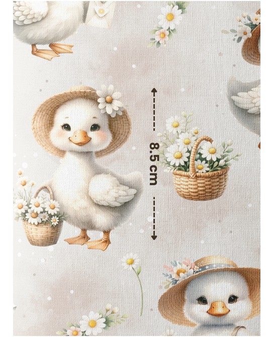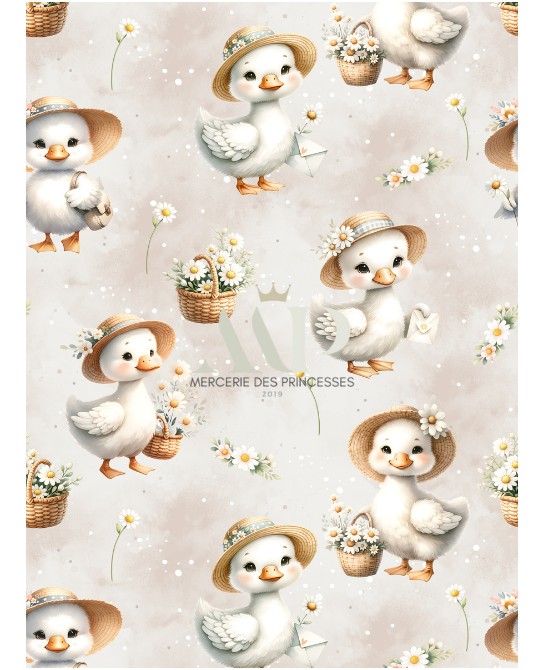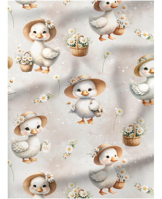 Ce motif nous invite dans un univers doux et champêtre, empreint de poésie et de sérénité. Sur un fond clair aux nuances délicatement poudrées, de charmants petits oisons prennent vie, coiffés de chapeaux de paille et entourés de marguerites légères, de feuillages subtils et de petits détails aériens qui renforcent l’atmosphère paisible et réconfortante.