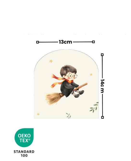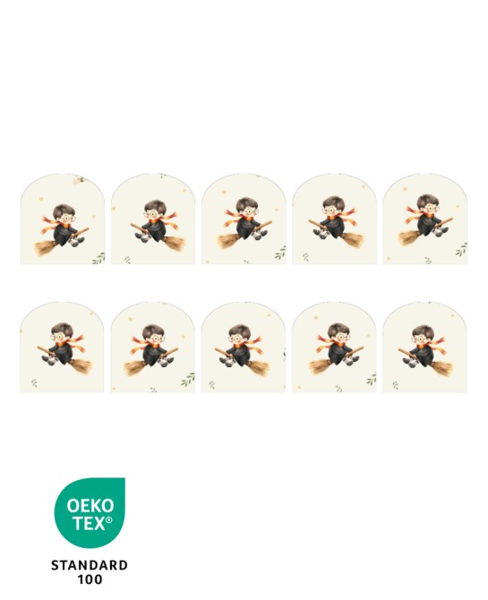 Panneau à coudre pour gants de toilette enfant, illustré d'un adorable petit sorcier au style aquarelle doux et poétique.