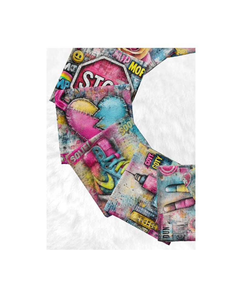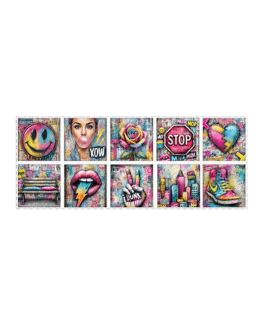 Il se compose de 10 carrés de 12 × 12 cm, illustrés de motifs urbains et pop art : graffiti colorés, symboles street, visuels modernes et graphiques inspirés de l’art urbain.