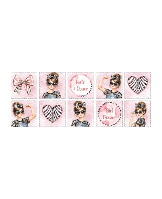 Il se compose de 10 carrés de 12 × 12 cm, illustrés de motifs féminins affirmés et graphiques : personnages stylisés à l’attitude assumée, cœurs zébrés, nœuds élégants et messages inspirants tels que « Forte & Douce » ou « Girl Power », dans une palette de roses poudrés et de contrastes noir et blanc.
