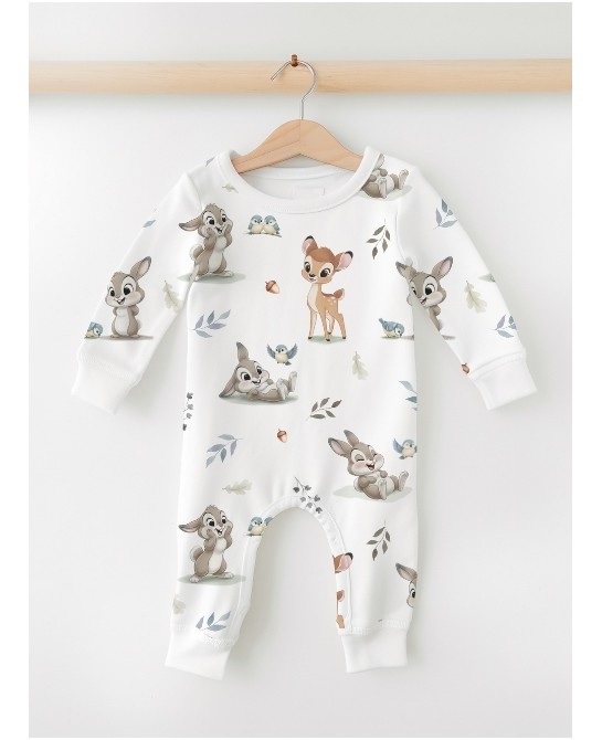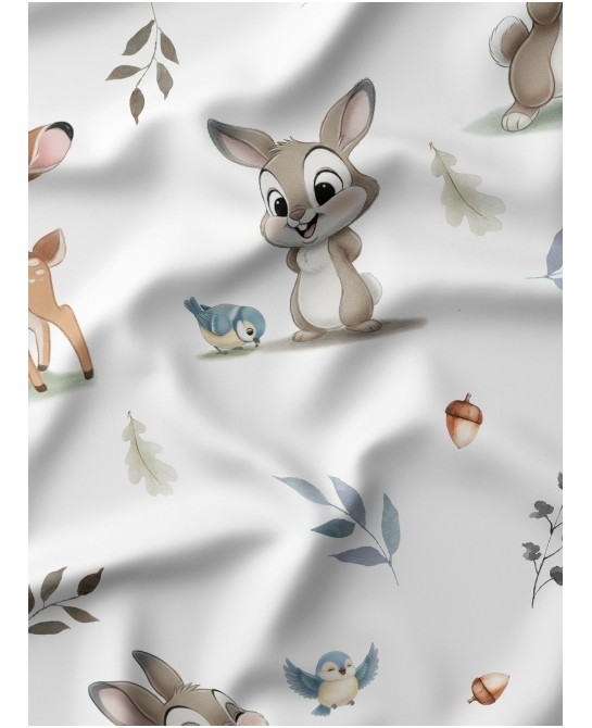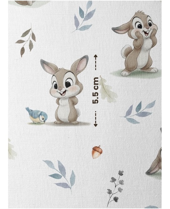 Le tissu « Lapin et Biche Bleu » capture toute la magie de l'enfance à travers une scène forestière pleine de douceur. Sur un fond blanc lumineux, de charmants petits lapins espiègles et des biches au regard attendrissant évoluent au milieu de feuillages stylisés, de glands, et de petits oiseaux bleus. Le motif, aéré et joyeux, évoque une balade en forêt empreinte de calme et de complicité.