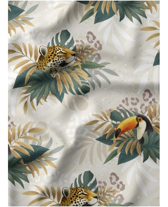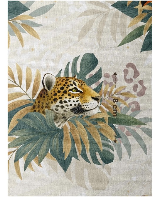 Le tissu « Léopard et Toucan » transporte instantanément dans un univers exotique, dense et raffiné. Sur un fond beige sablé aux effets légèrement mouchetés, majestueux léopards au pelage doré et grands toucans au bec éclatant se dissimulent entre de luxuriantes feuilles tropicales aux tons verts, ocres et mordorés. En arrière-plan, des empreintes félines se devinent subtilement, ajoutant une profondeur discrète et harmonieuse à l’ensemble.