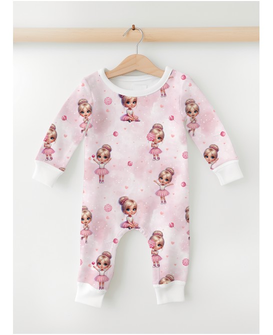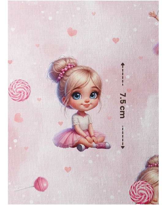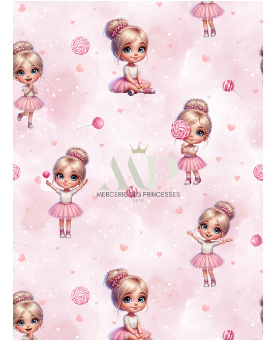 Ce motif nous entraîne dans un univers doux et gourmand, résolument girly et poétique. Sur un fond rose poudré délicatement texturé, de jolies petites ballerines aux grands yeux lumineux évoluent parmi des sucettes et de petits cœurs, créant une atmosphère tendre et joyeuse.