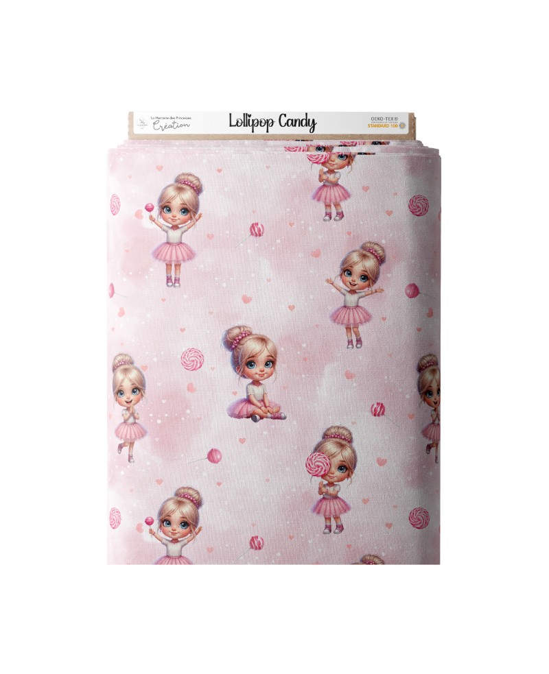 Tissu Lollipop Candy en coton certifié Oeko-Tex®, au motif girly rose avec petites ballerines et sucettes, parfait pour des créations couture douces et gourmandes.