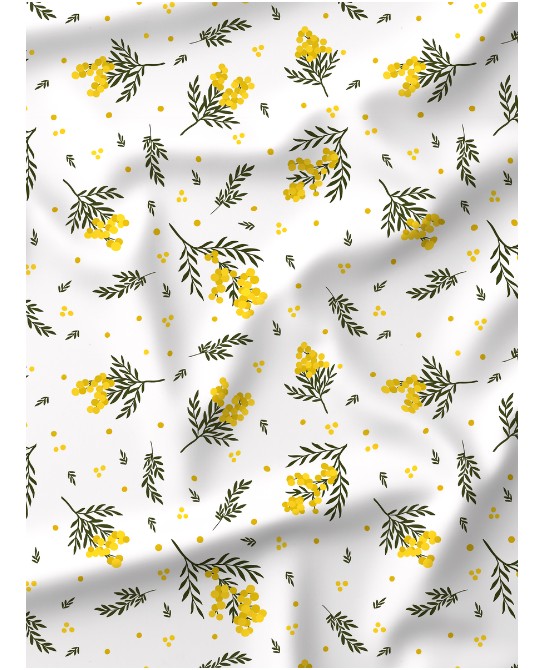 Disponible sur de nombreux supports textiles — toile de coton, jersey, French Terry, double gaze, satin, imperméable, softshell, Panama, bambou ou tissu UV+ — Bloomie – Mimosa s’adapte à tous vos projets.