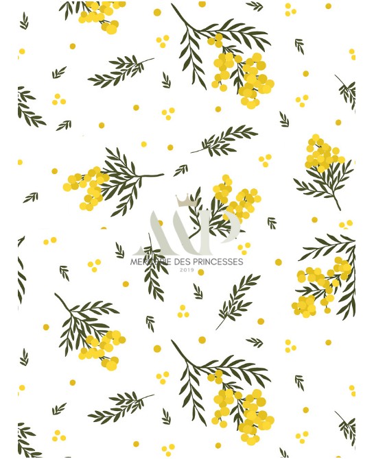 Le motif Bloomie – Mimosa revisite l’esprit floral intemporel dans une version lumineuse et naturelle. Sur un fond clair subtilement texturé, de fines branches de mimosa se déploient avec légèreté, mêlant de petites fleurs jaune doré à des feuillages verts délicats pour un rendu doux et équilibré.