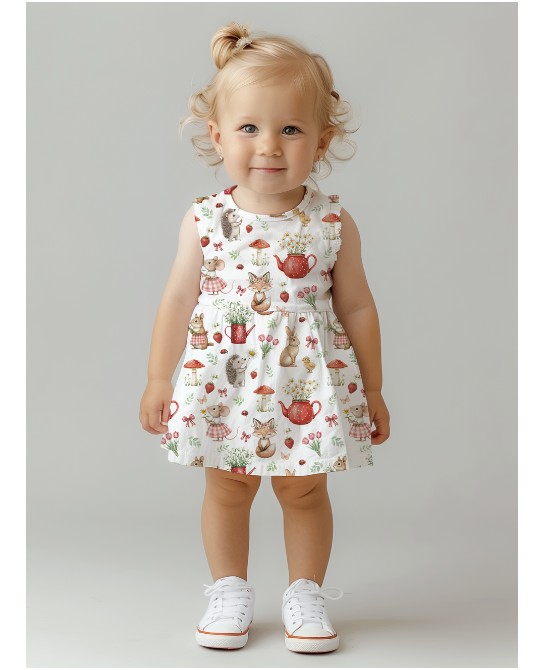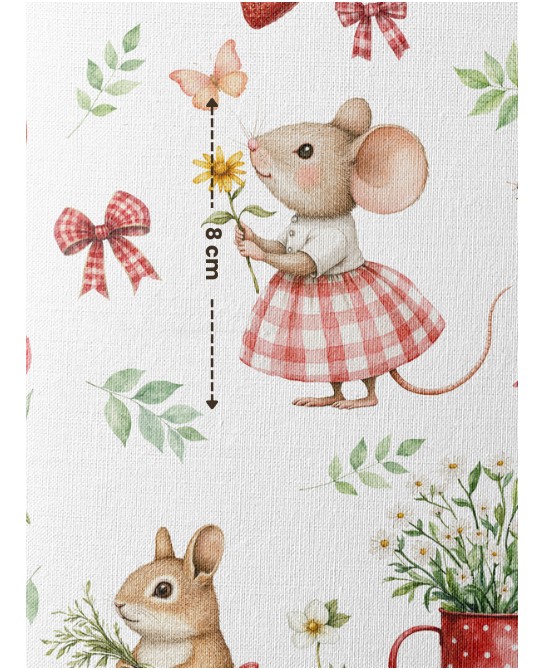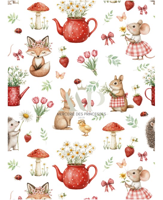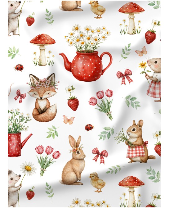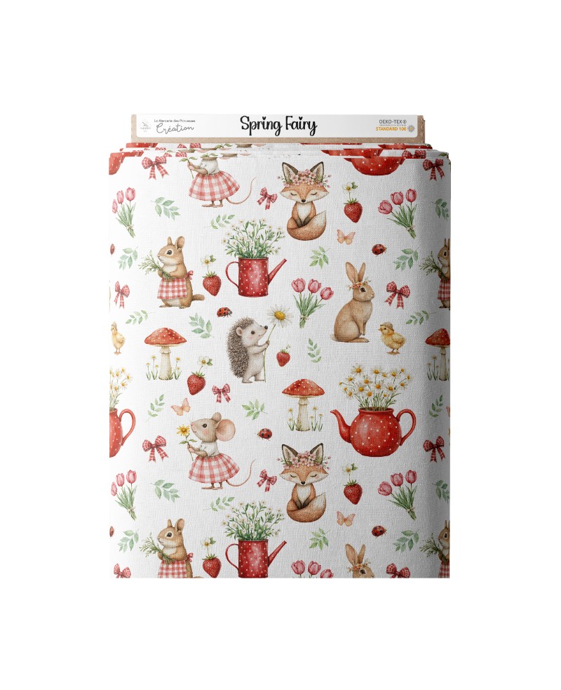 Le tissu « Spring Fairy » invite à une promenade enchantée au cœur d’un jardin féerique, où de tendres petits animaux de la forêt prennent vie dans une atmosphère douce et poétique. Lapins, renards, hérissons et souris évoluent avec délicatesse parmi les fleurs de printemps, les fraises, les champignons et de charmants accessoires rétro, sur un fond clair et lumineux. L’ensemble évoque la magie du renouveau, la douceur de l’enfance et la poésie des contes illustrés.