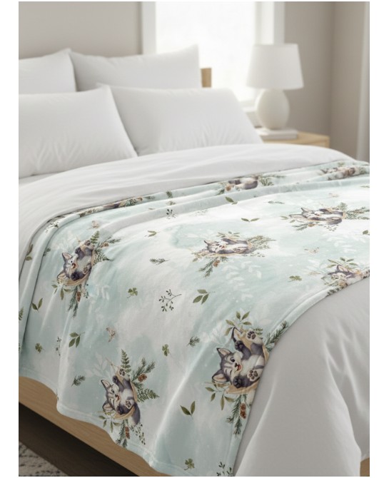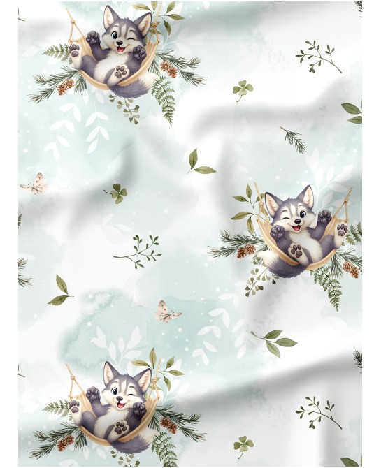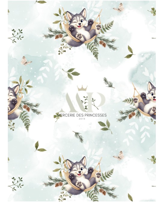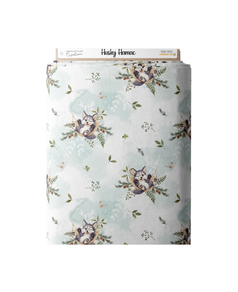 Le tissu « Husky Hamac » met en scène un adorable petit husky blotti dans son hamac, au cœur d’un univers végétal léger et poétique. Sur un fond aquarellé aux nuances bleu doux et vert sauge, le chiot malicieux se balance paisiblement, entouré de branches de sapin, feuillages délicats et petits papillons. L’ensemble crée une atmosphère apaisante, fraîche et pleine de tendresse.