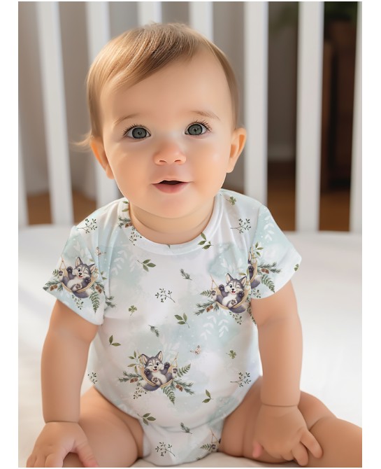 Les teintes naturelles mêlent gris doux, beige chaud et verts subtils, rehaussés par la douceur du fond pastel. Le style aquarelle, aux détails fins et soignés, apporte profondeur et légèreté, tout en conservant un rendu tendre et enfantin. Un motif équilibré, respirant, qui laisse de l’espace et évite toute surcharge visuelle.