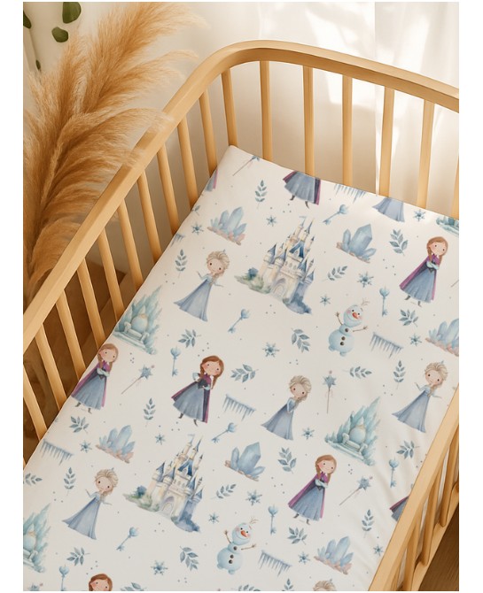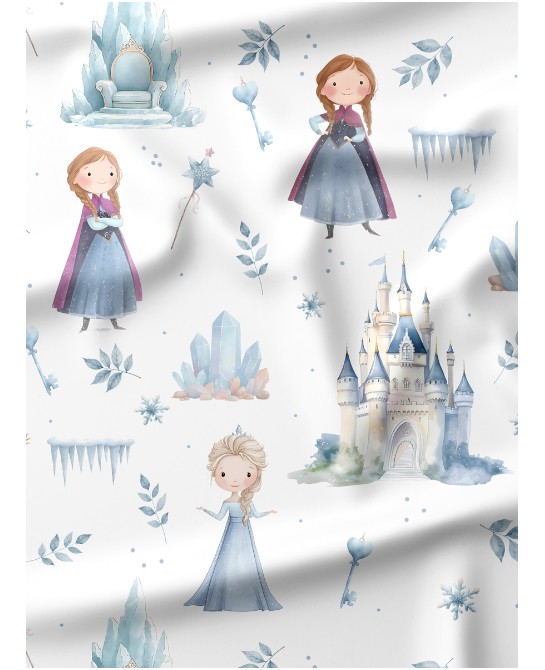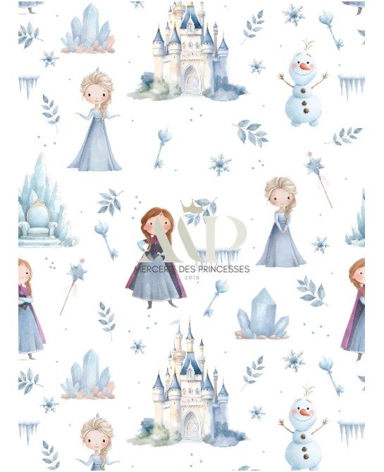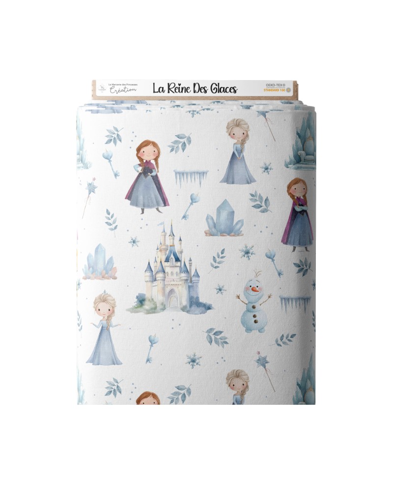 Le tissu « La Reine des Glaces » vous plonge dans un univers féerique inspiré des contes hivernaux. Sur un fond aux nuances glacées se dévoilent une princesse aux cheveux clairs, un château scintillant, des cristaux de glace, une clé enchantée et un adorable bonhomme de neige. L’ensemble crée une atmosphère lumineuse, douce et merveilleuse, parfaite pour l’univers bébé et enfant.
