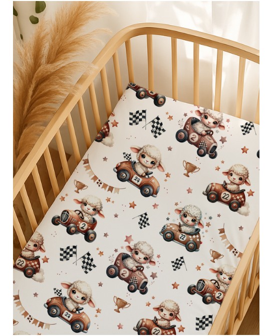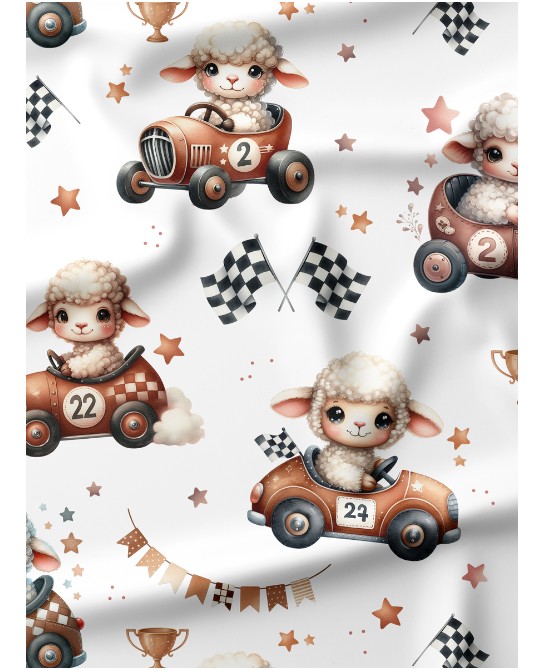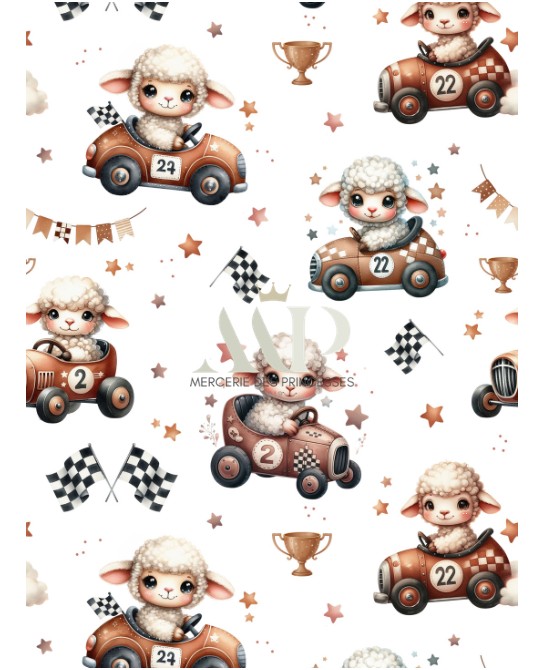 Le tissu « Voiture de Course Mouton » vous plonge dans un univers joyeux et vintage où d’adorables petits moutons prennent le volant de voitures rétro. Autour d’eux : drapeaux à damier, étoiles scintillantes, trophées et fanions festifs composent une scène dynamique et ludique, parfaite pour l’univers bébé et enfant.