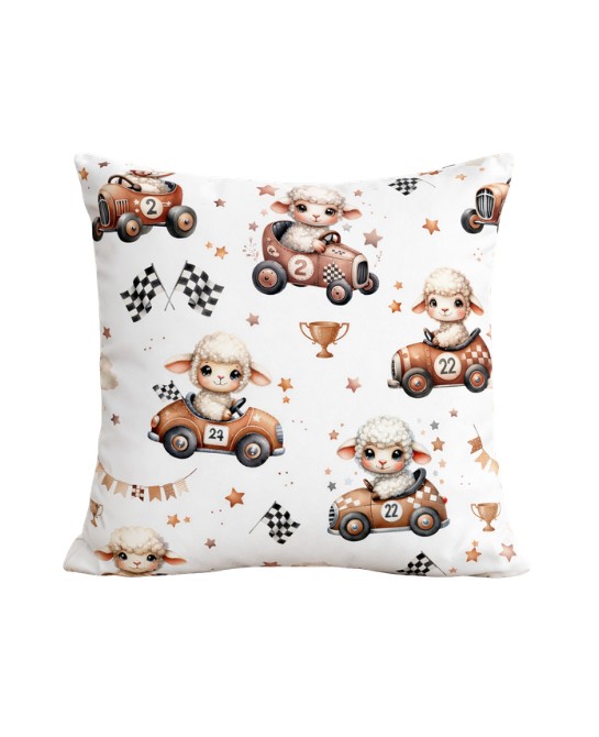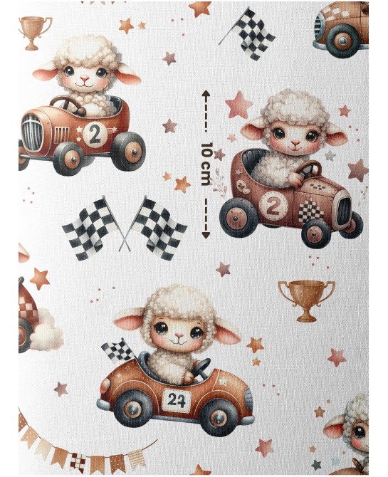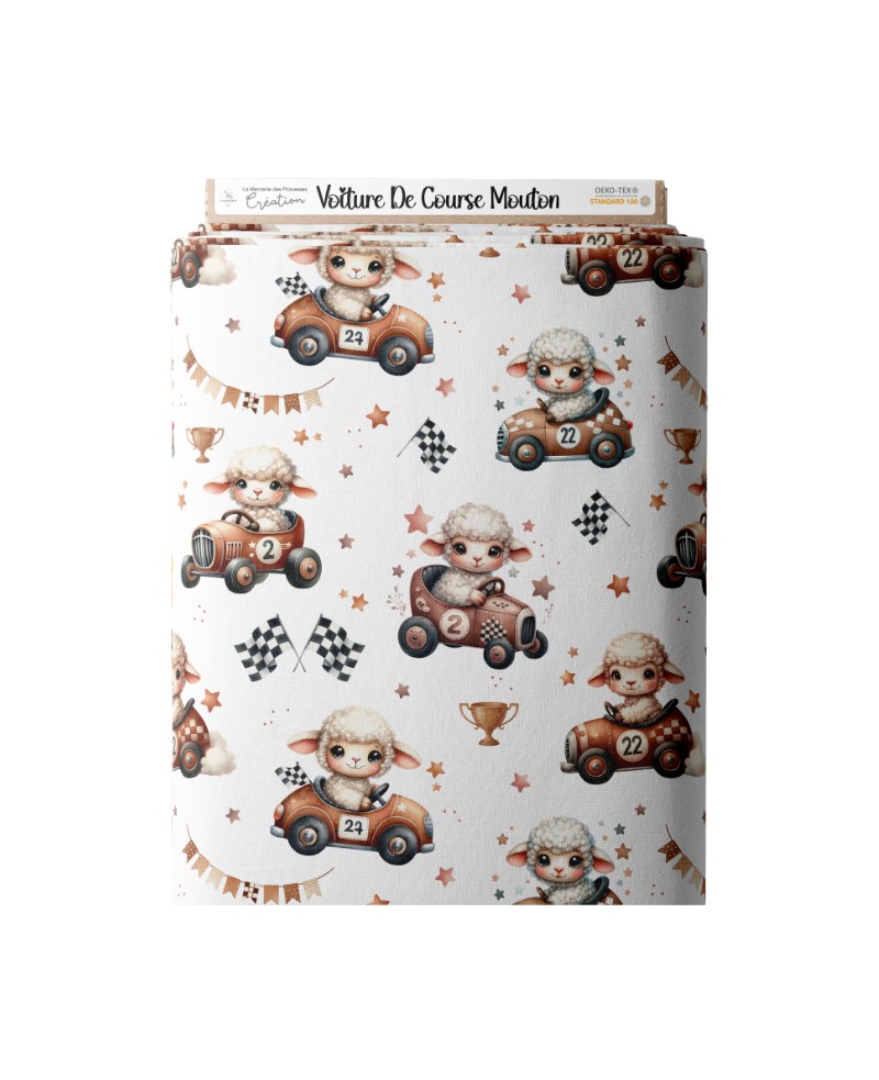 Tissu coton “Voiture de Course Mouton” – Motif petits moutons pilotes vintage – Certifié Oeko-Tex®
