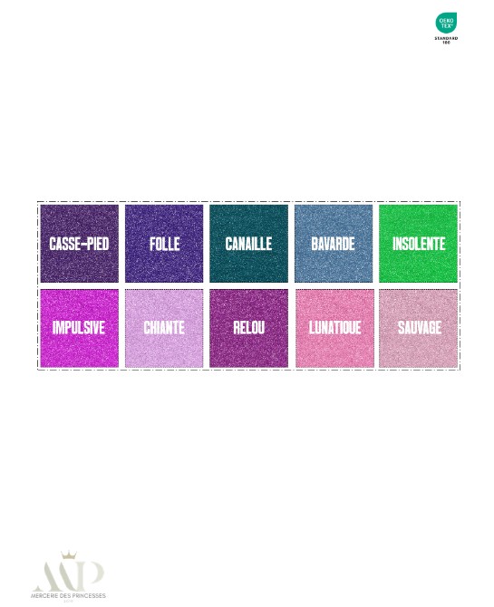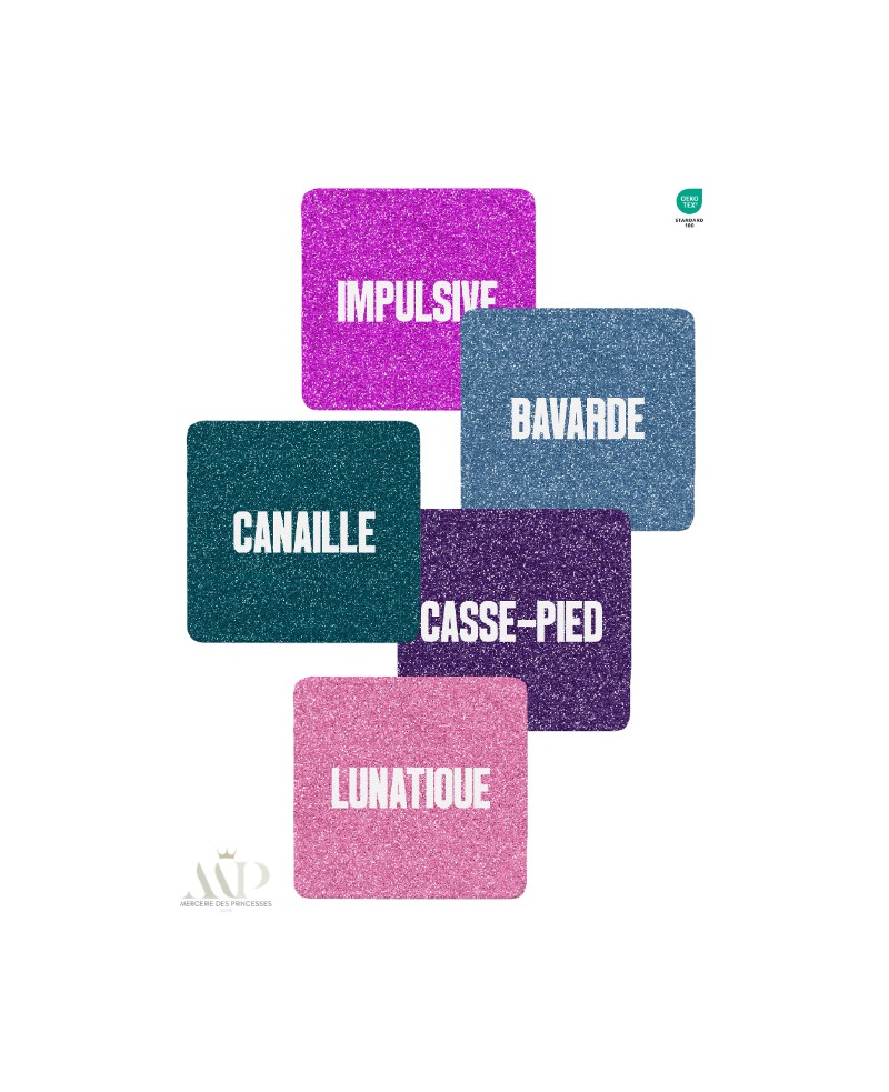 Panneau en coton premium certifié Oeko-Tex Standard 100, composé de carrés pailletés aux mots audacieux et pleins de caractère. Un design original qui apporte une touche d’humour et d’attitude à vos créations zéro déchet.