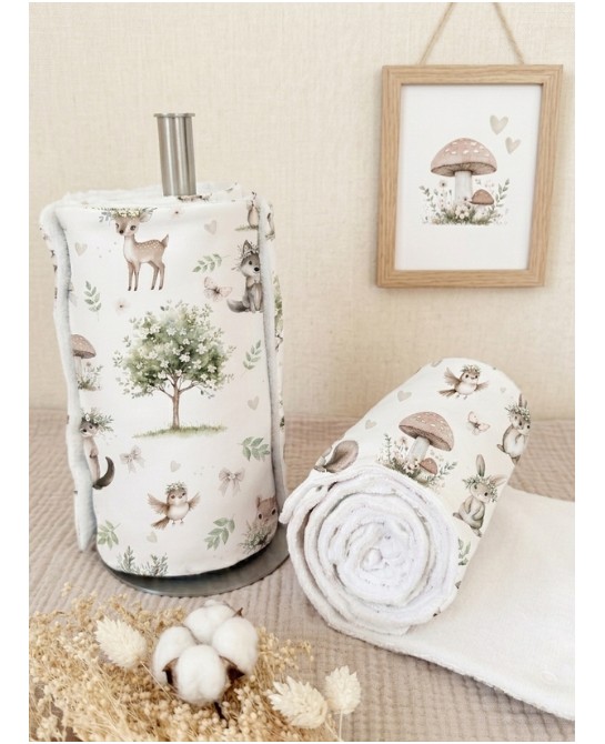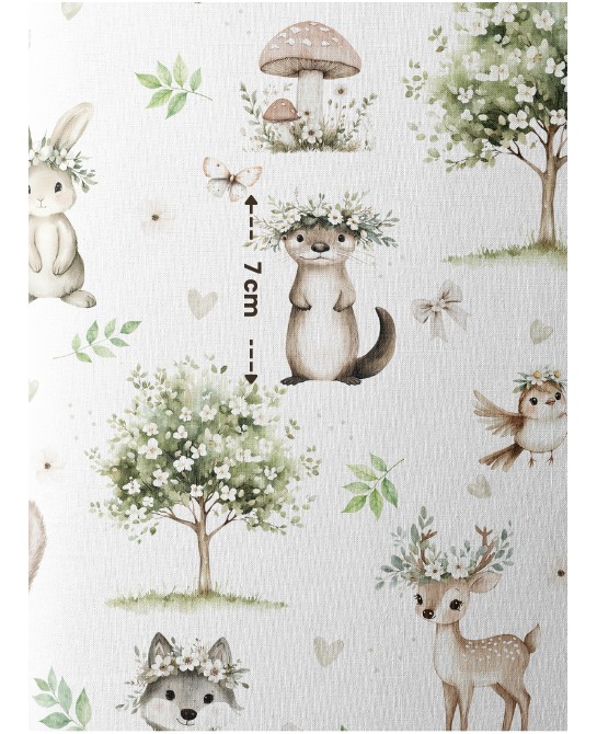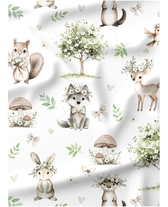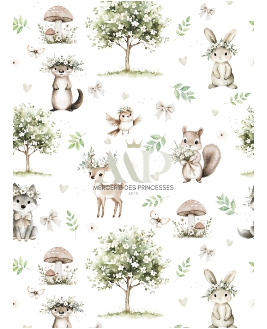 Le tissu « Forêt Enchantée » vous plonge dans une ambiance naturelle et poétique inspirée des balades en sous-bois. Sur un fond clair et lumineux se dévoilent de tendres animaux de la forêt : une petite biche délicate, un lapin malicieux, un écureuil attendrissant et un oiseau aux ailes ouvertes, entourés de feuillages, de fleurs sauvages, de champignons et de jolis rubans. L’ensemble crée une atmosphère douce, apaisante et pleine de charme, parfaite pour l’univers bébé et enfant.