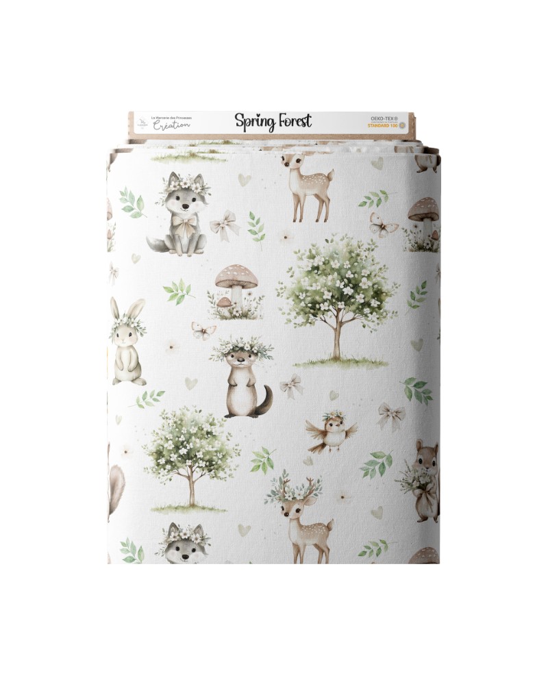 Tissu coton “Spring Forest” – animaux de la forêt, fleurs et arbre printanier aquarelle – Certifié Oeko-Tex®