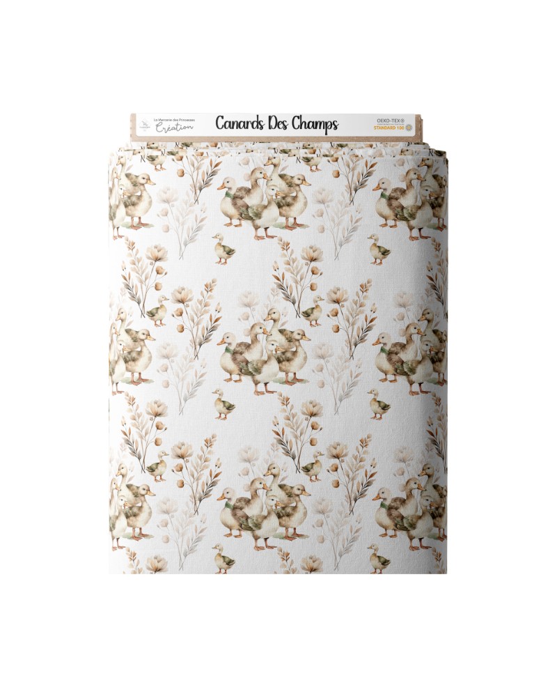 Créez un univers doux et naturel avec le tissu “Petits Canards des Champs”, un coton certifié Oeko-Tex® Standard 100 illustré de petits canards entourés de fleurs et feuillages délicats dans un style aquarelle tendre.