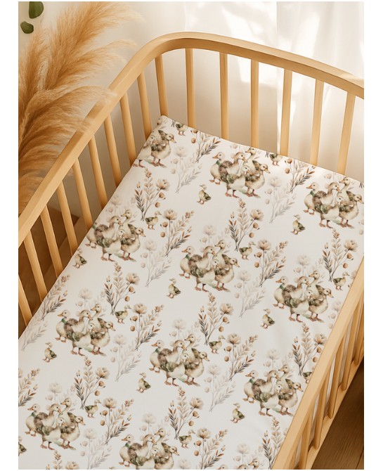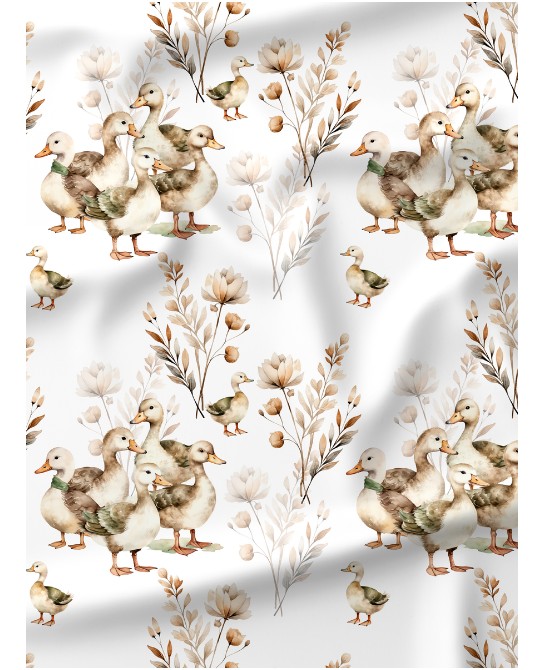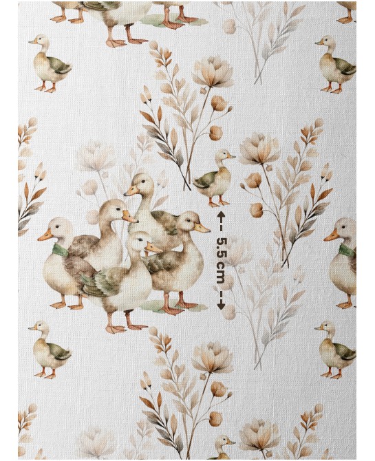 Le tissu « Petits Canards des Champs » met en scène d’adorables canards entourés de fleurs sauvages et de feuillages délicats dans un style aquarelle naturel et apaisant. Les teintes douces mêlant beige, sable, terracotta et vert tendre créent une atmosphère chaleureuse et intemporelle, idéale pour l’univers bébé et enfant.