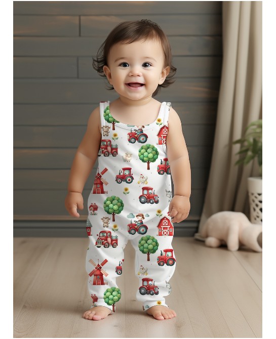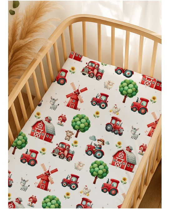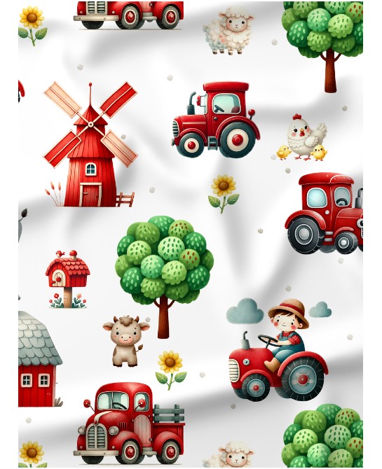 Le tissu « Petite Ferme Rouge » met en scène un adorable décor de ferme avec de jolis tracteurs rouges, un moulin, une grange, des animaux de la ferme et de petits éléments de campagne. Illustré dans un style doux et ludique, il crée une atmosphère chaleureuse et amusante parfaite pour l’univers bébé et enfant.