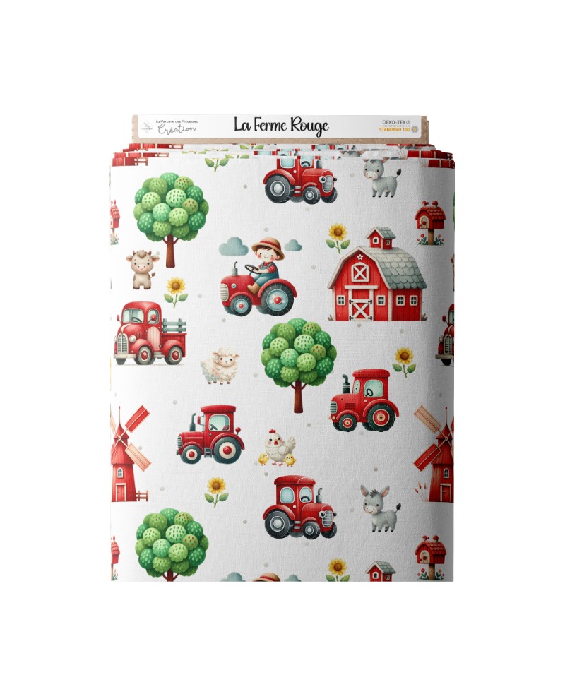 Créez un univers joyeux et champêtre avec le tissu “Petite Ferme Rouge”, un coton certifié Oeko-Tex® Standard 100 illustré de tracteurs rouges, animaux de la ferme, moulins, granges et petits éléments de campagne dans un style doux et ludique.