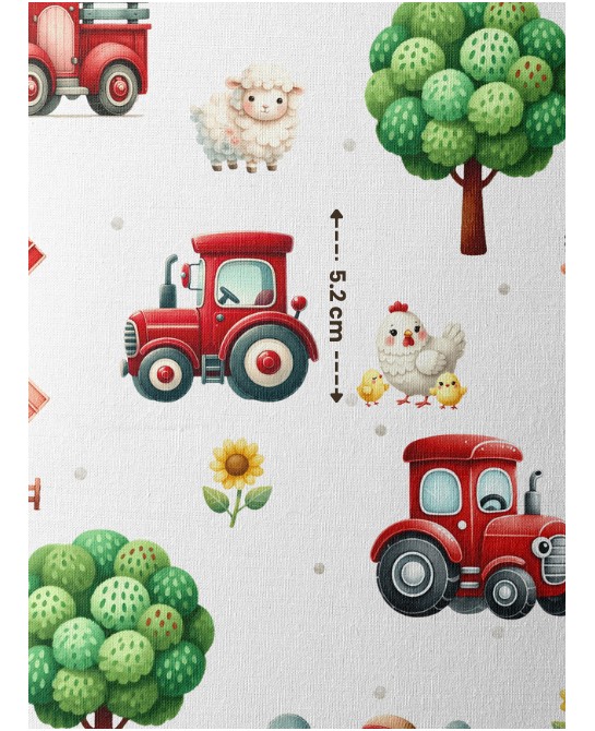 Tissu coton “La Ferme Rouge” – Motif tracteurs et animaux de la ferme – Certifié Oeko-Tex®