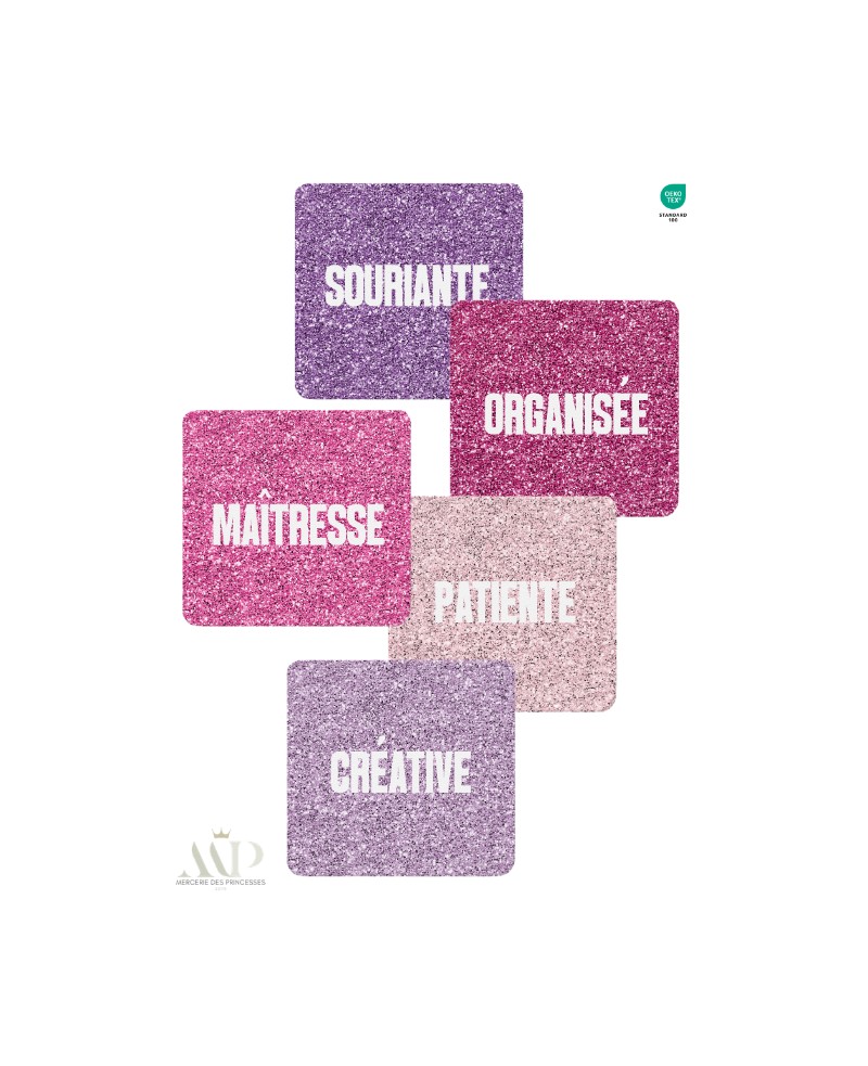 Panneau 10 Lingettes Lavables Spécial Maîtresse Rose – Messages Positifs Impression Pailleté – DIY Couture