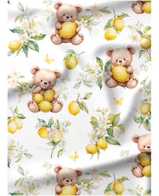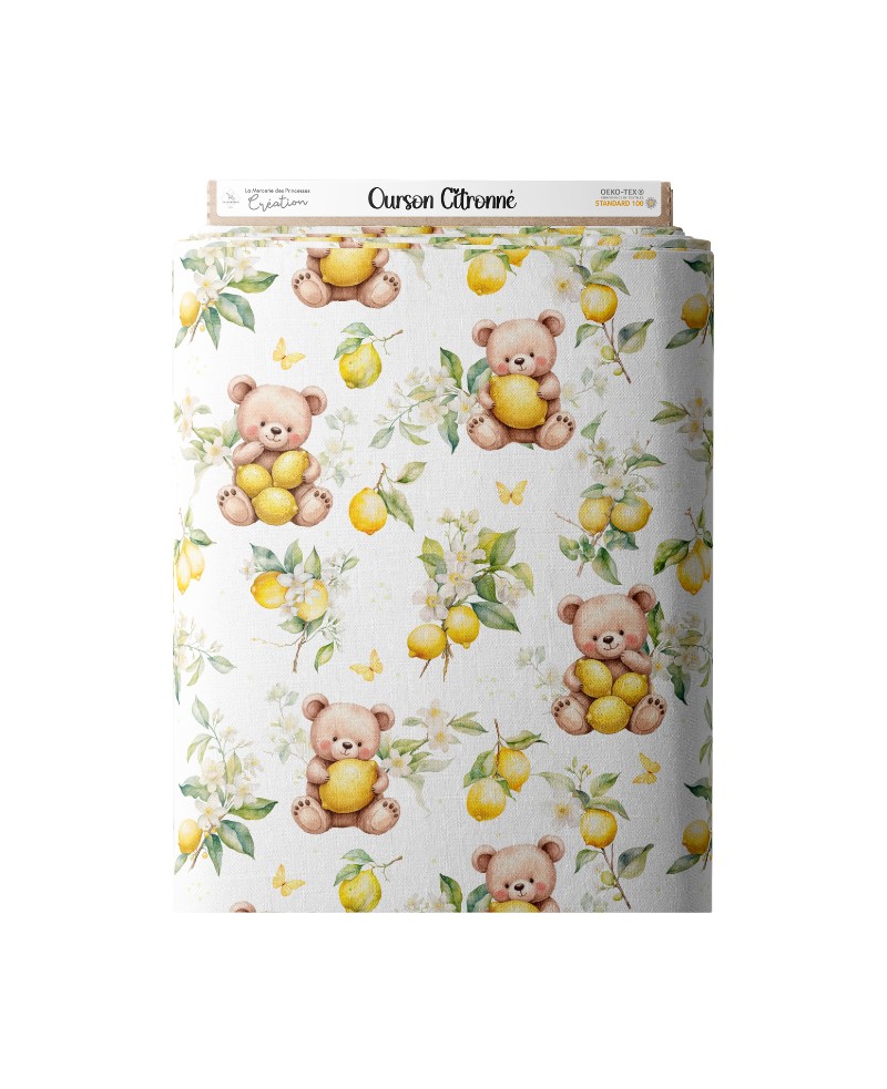 Tissu coton “Ourson Citronné” – Motif ours et citron fleuri – Certifié Oeko-Tex®