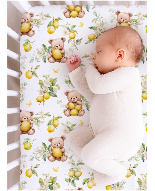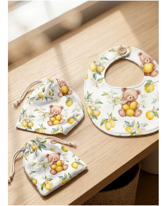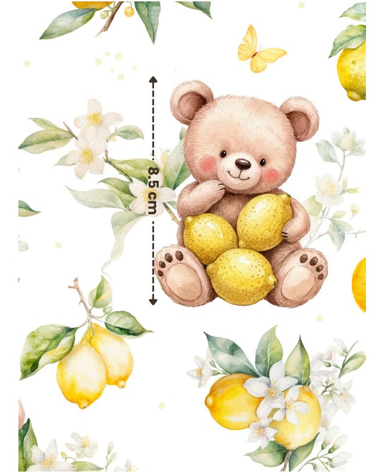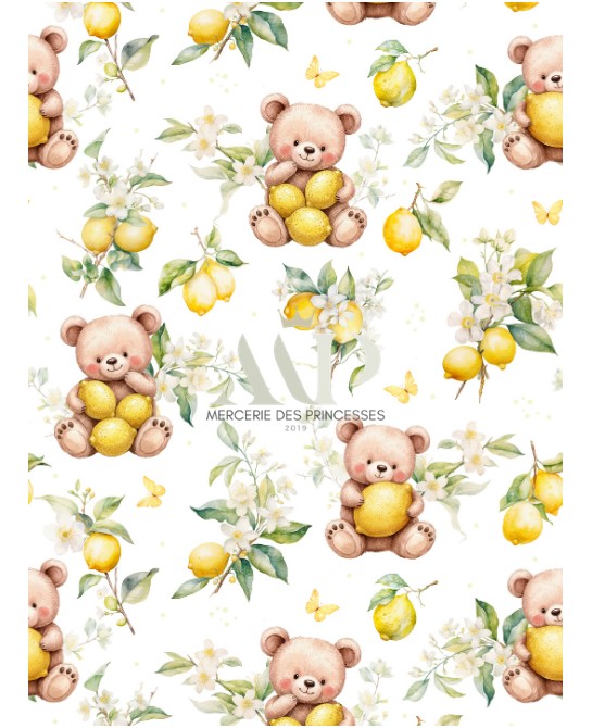 Le tissu « Ourson Citronné » met en scène d’adorables oursons câlinant de jolis citrons, entourés de feuillages légers, fleurs blanches et petits papillons. Illustré dans un style aquarelle tendre et raffiné, il crée une atmosphère apaisante et lumineuse, parfaite pour l’univers bébé et enfant.