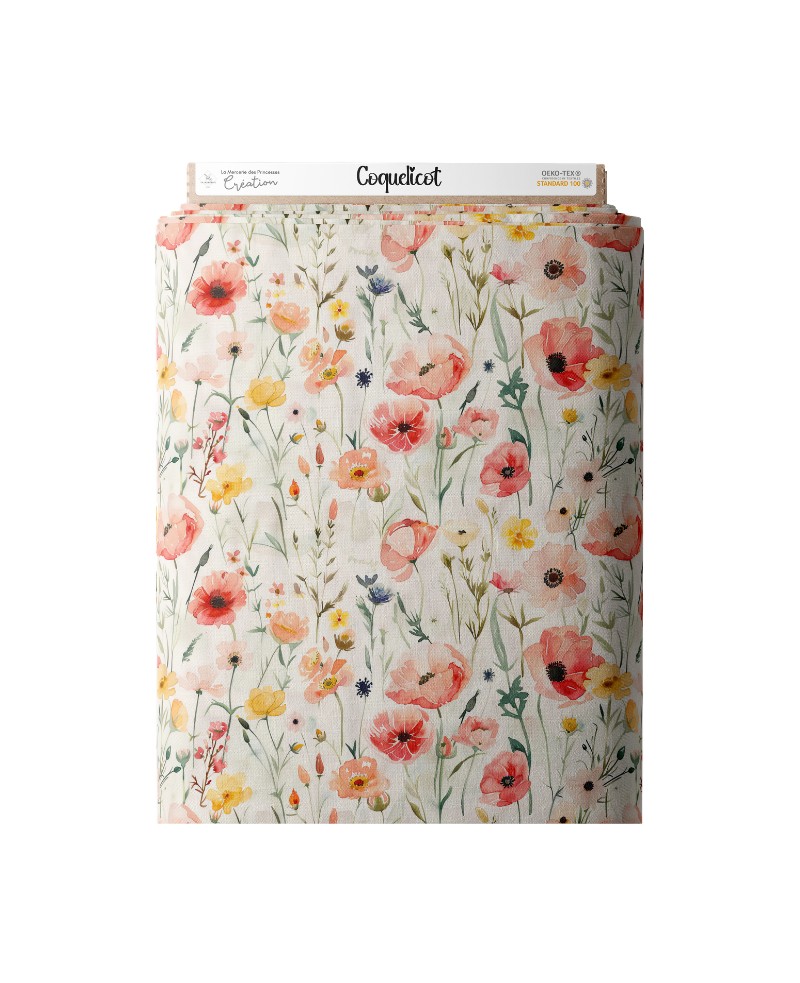 Un tissu “Coquelicot” aux fleurs champêtres corail, rose et jaune sur fond écru, en coton certifié Oeko-Tex, idéal pour des créations fraîches et élégantes.