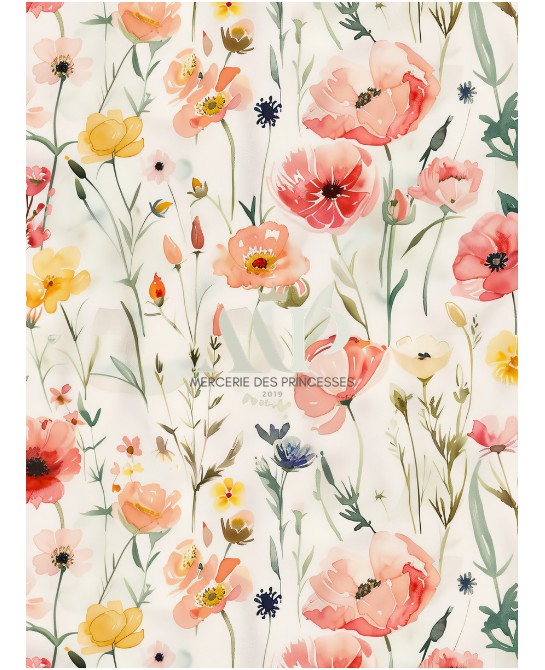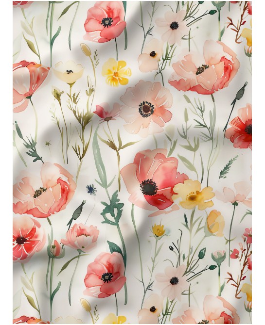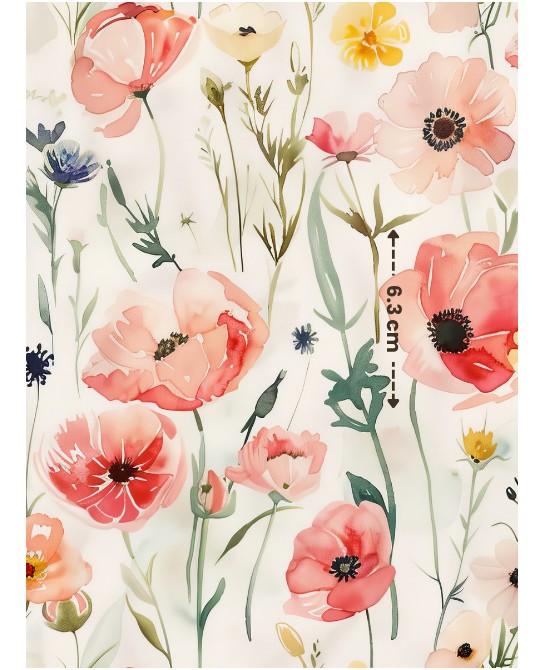 Le motif Coquelicot capture toute la beauté des fleurs sauvages dans une version délicate, lumineuse et pleine de fraîcheur. Sur un fond écru naturel, de jolis coquelicots aux teintes corail s’épanouissent aux côtés de petites fleurs champêtres dans des nuances de rose tendre, jaune doux et feuillages fins, pour une composition à la fois légère et harmonieuse.