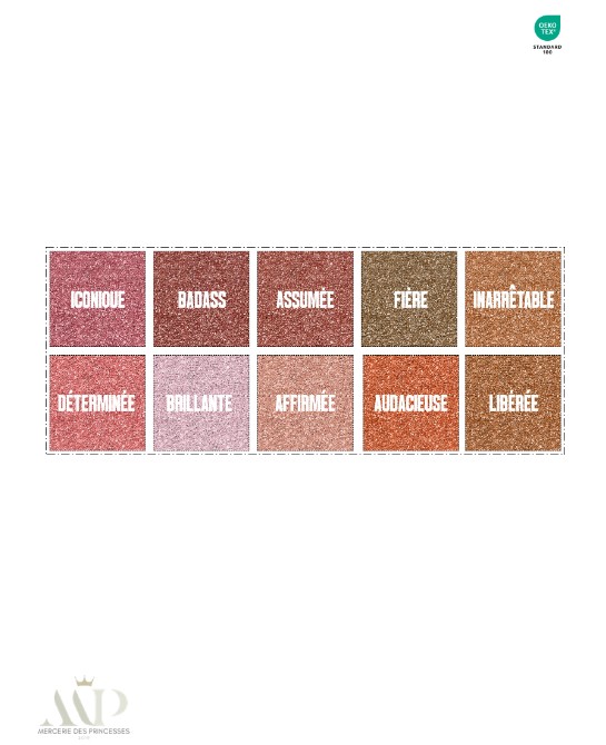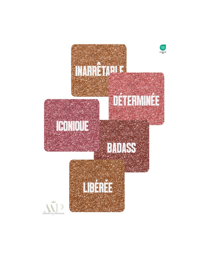 Panneau en coton premium certifié Oeko-Tex Standard 100, composé de carrés pailletés aux messages forts et inspirants : femme libre, affirmée, audacieuse. Un design lumineux et puissant, pensé pour celles qui assument leur style et leur indépendance jusque dans leur routine beauté zéro déchet.
